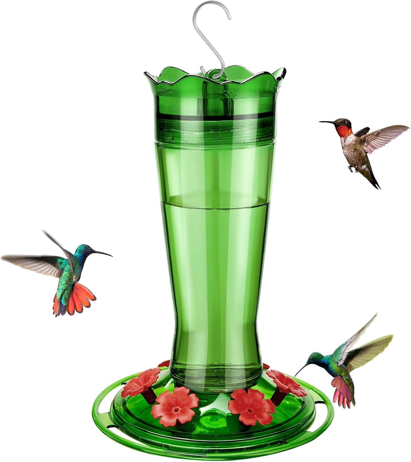 This attractive green glass feeder is designed for hanging on a bird feeding pole, tree branch, or fence post. It features six feeding ports and a built-in ant moat, allowing multiple hummingbirds to feed at once while keeping nectar safe from pests.
